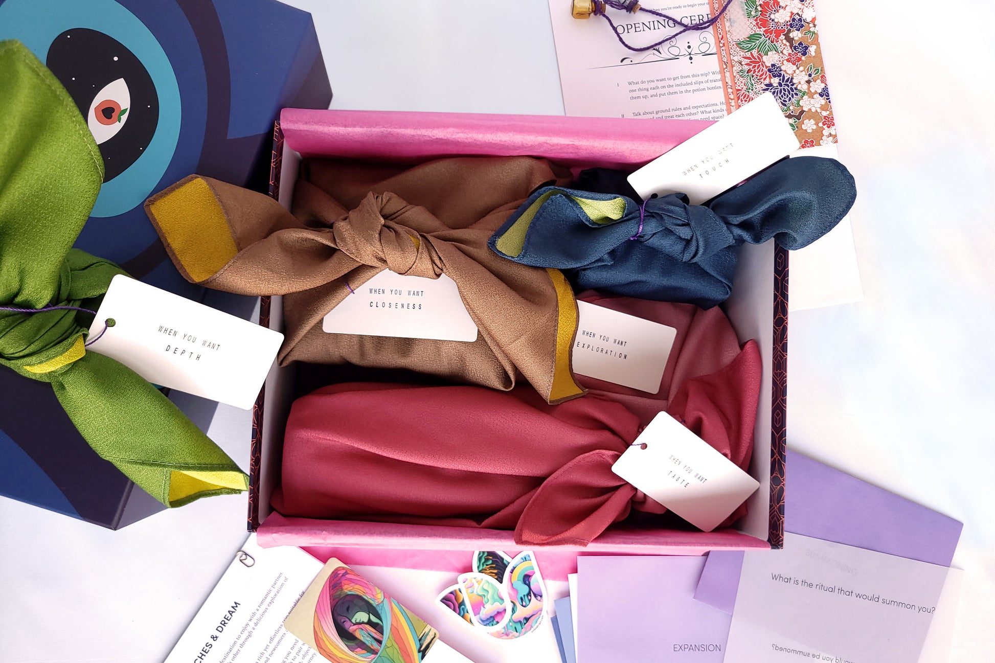 Each is wrapped in a reusable wrapping cloth, with a label hinting at what's inside (“When you want Closeness”, “When you want Exploration”, etc.)