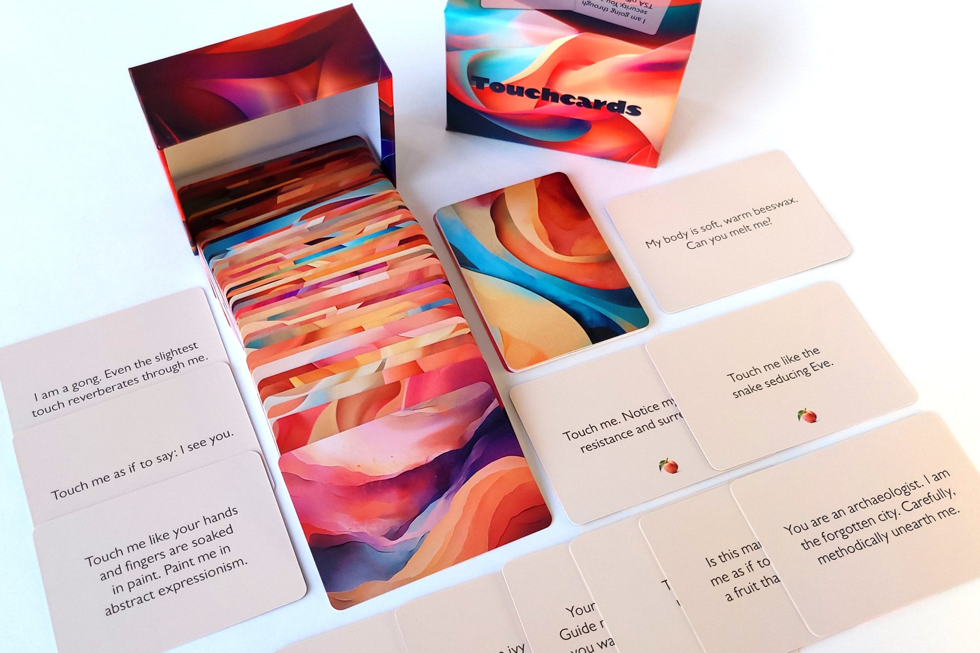 Touchcards is an exploratory card game for two or more players. Precise, playful, and poetic prompts invite you to discover new ways to express yourself with touch. Play with lovers, friends, or family, as innocently or intimately as you like.